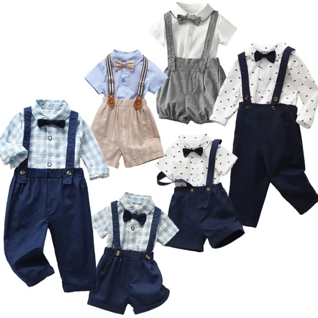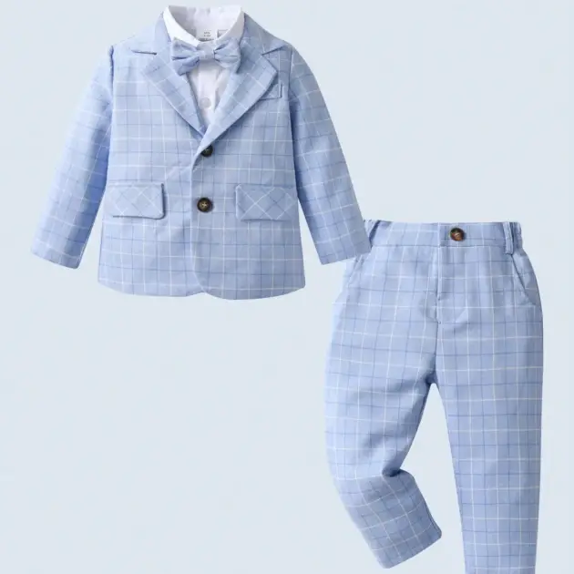 Baby Boy Formal Suit Set: Light Blue Grid Plaid Jacket, Pants & Bowtie Shirt for Birthday or Wedding