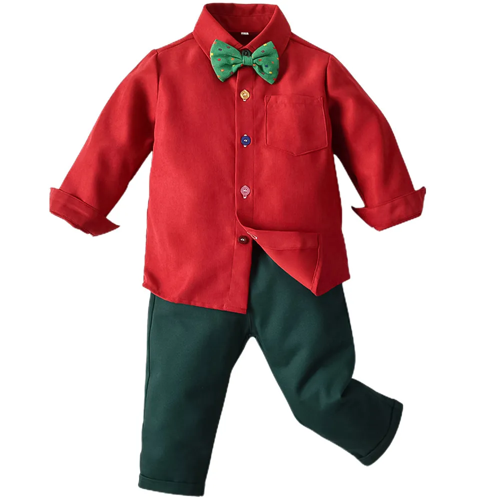1Set Bow Tie Shirt Suspender Trouser Set Kids Clothing Long Sleeve Festival Wear Christmas New Year Party Outfit Comfortable