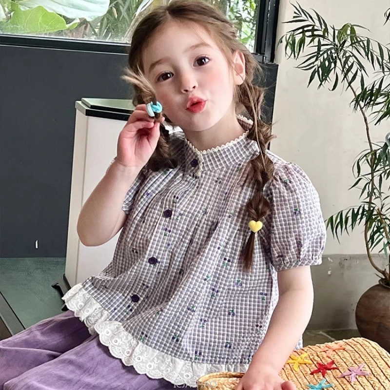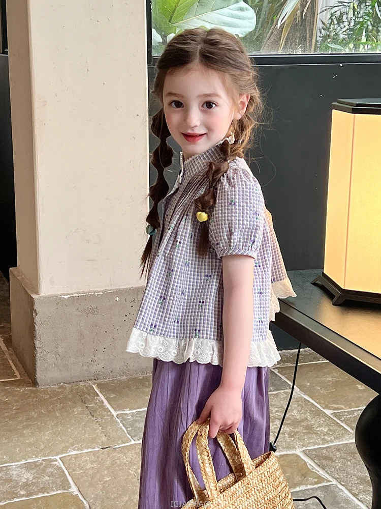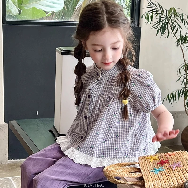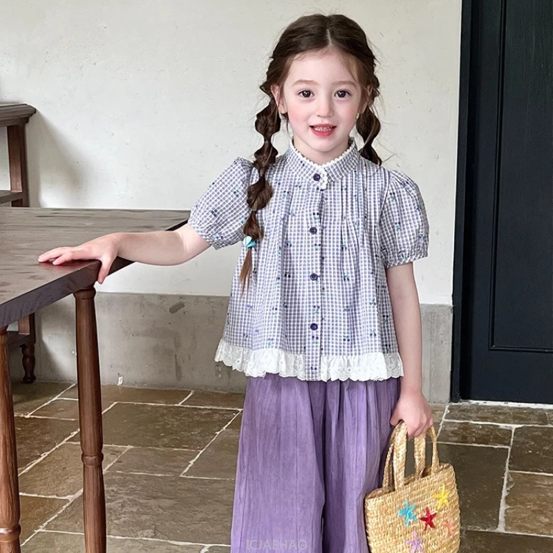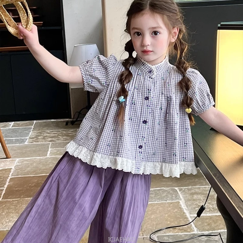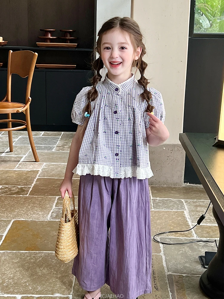 Girls Korean Style Cotton Shirt With Bubble Sleeves And Wide Leg Pants 2 Piece Set Casual Clothes Fashion Daily Wear Summer