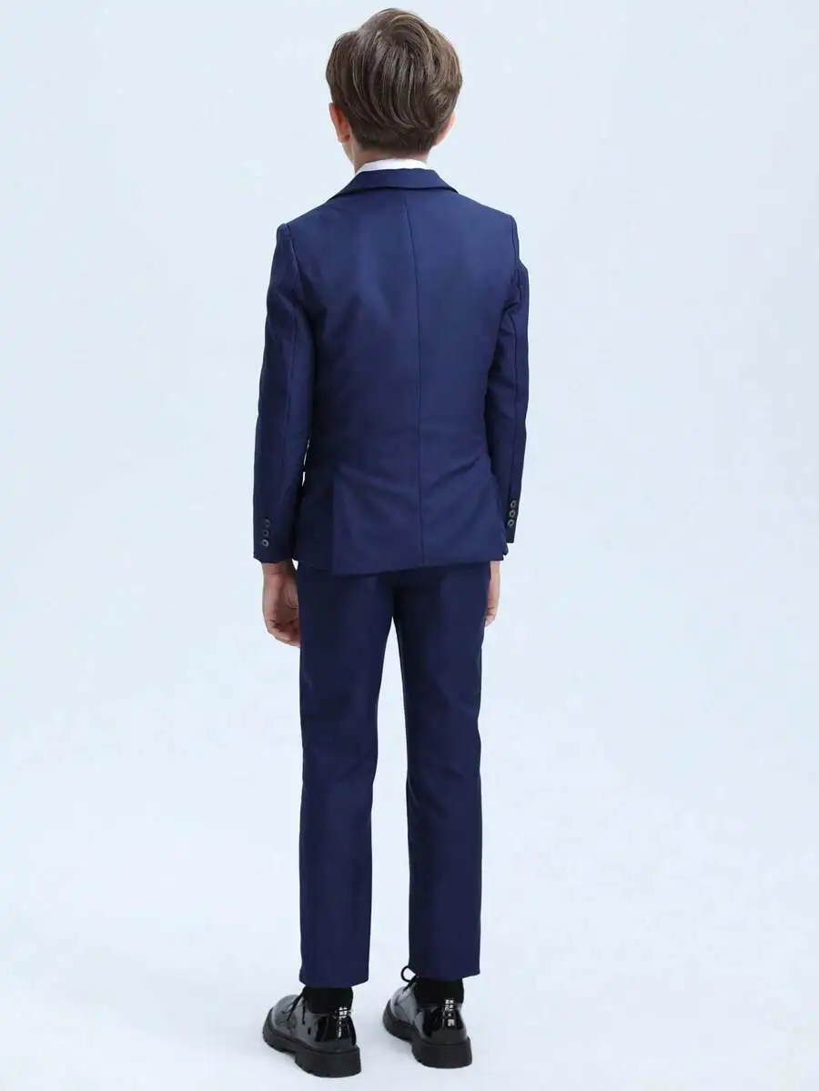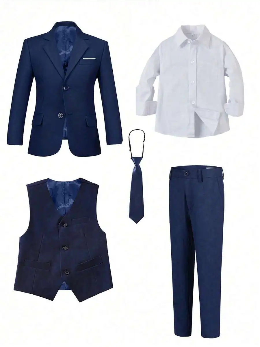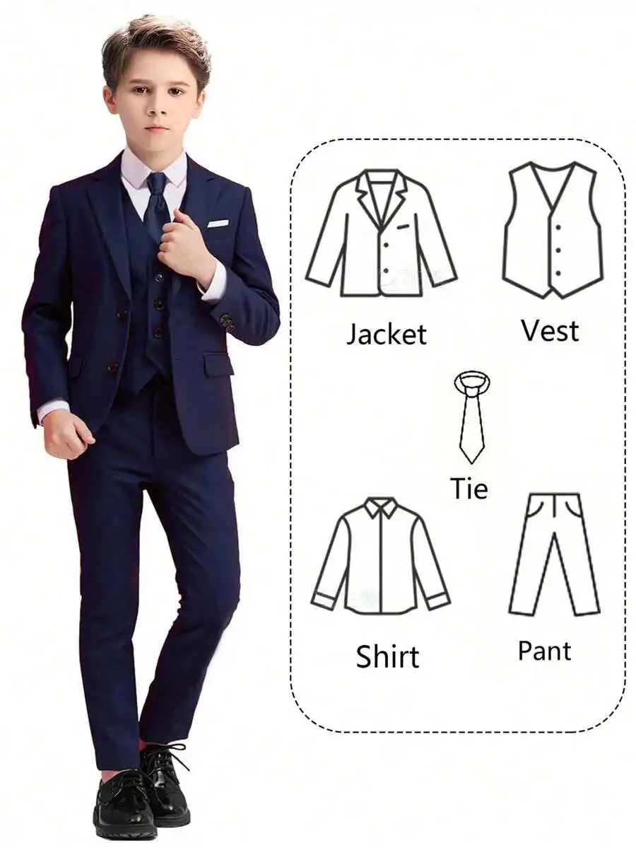 5-Piece Navy Blue Formal Suit Set for Boys, Includes Jacket, Vest, Pants, Shirt & Tie