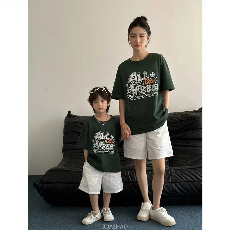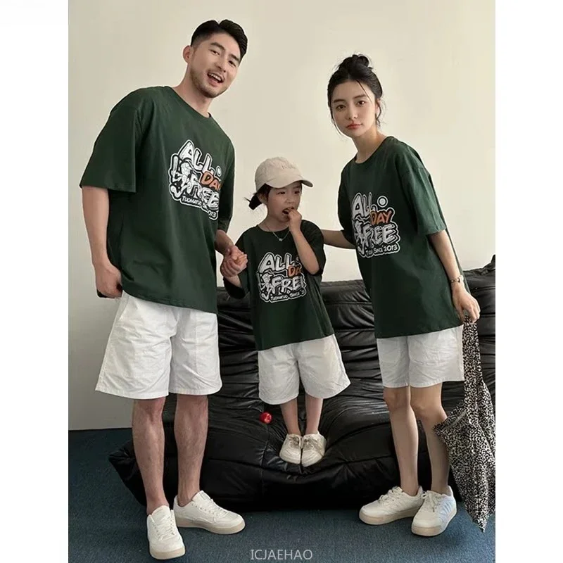 Family Green T-shirt Korean Mom Dad and Daughter Son Tees Shorts Two Pieceand Children Cotton Clothes Sets Outfit Father Mother