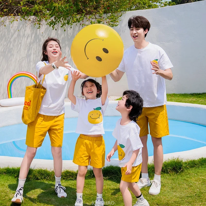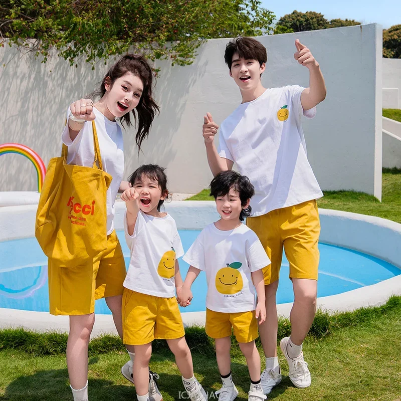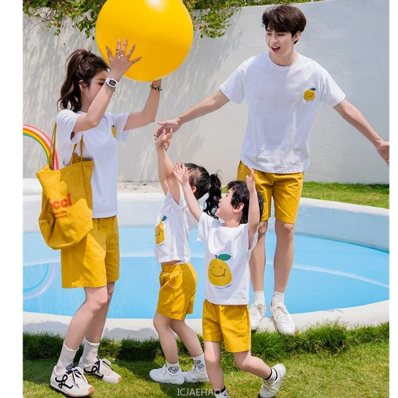 Funny Family Matching Outfits Korean Parent-child Clothes Cotton Short Sleeve T Shirts Shorts Set Father Mother and Son Daughter