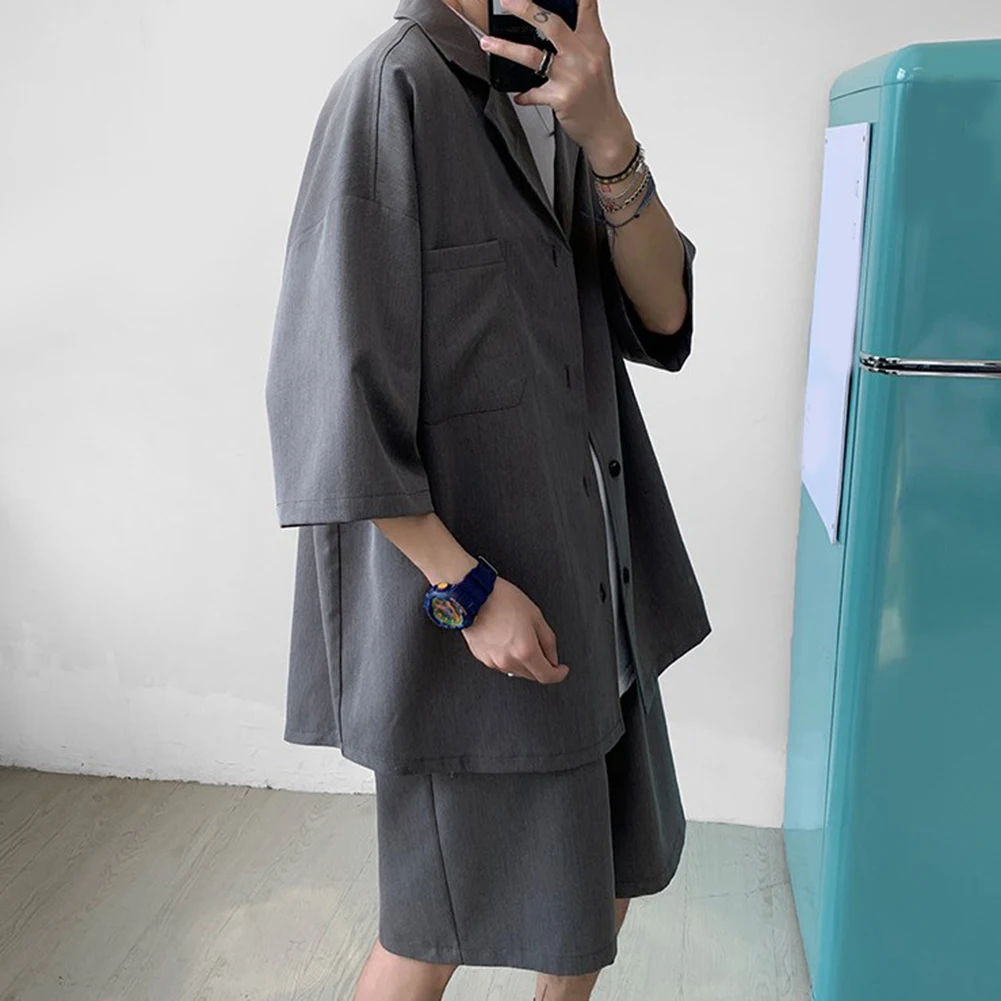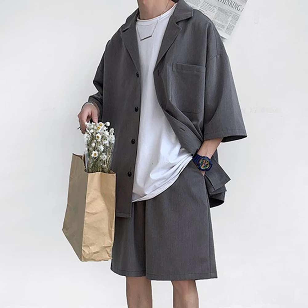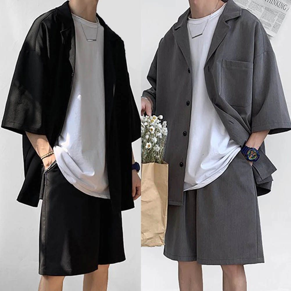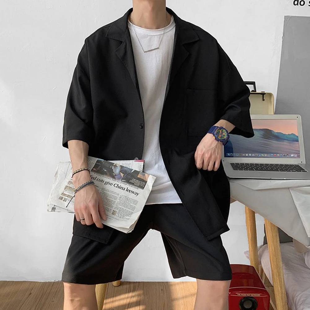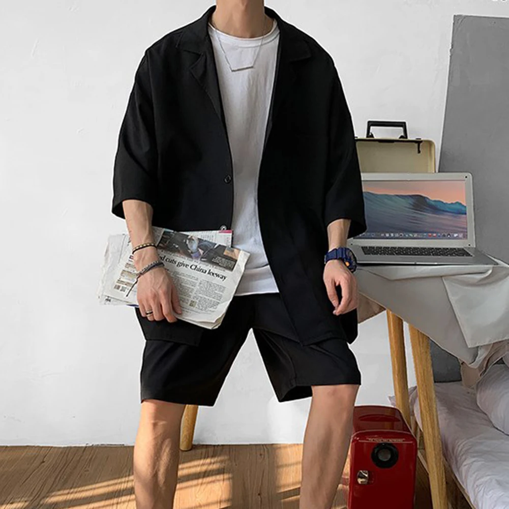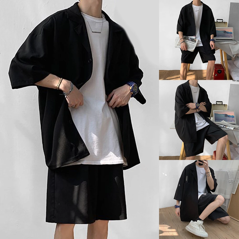 * Item Features:Men,Summer 2 Piece Set,Suit Jacket and Shorts,Korean Style Clean Fit Loose Short Shirt Outfits