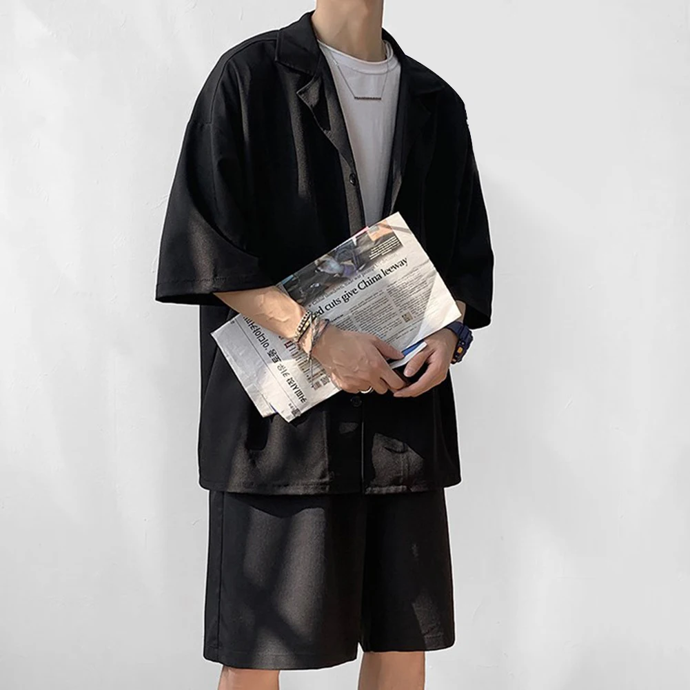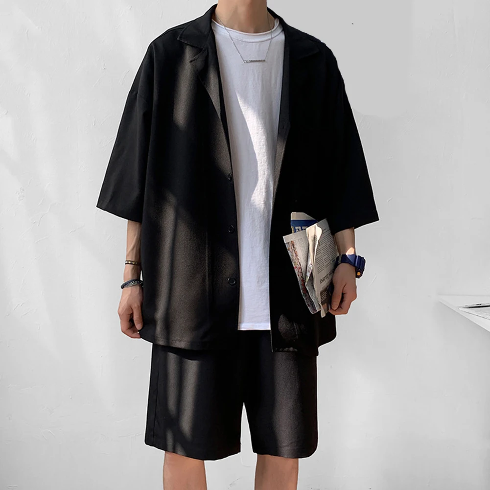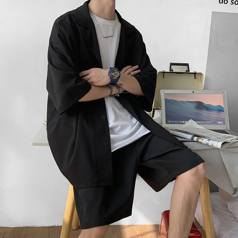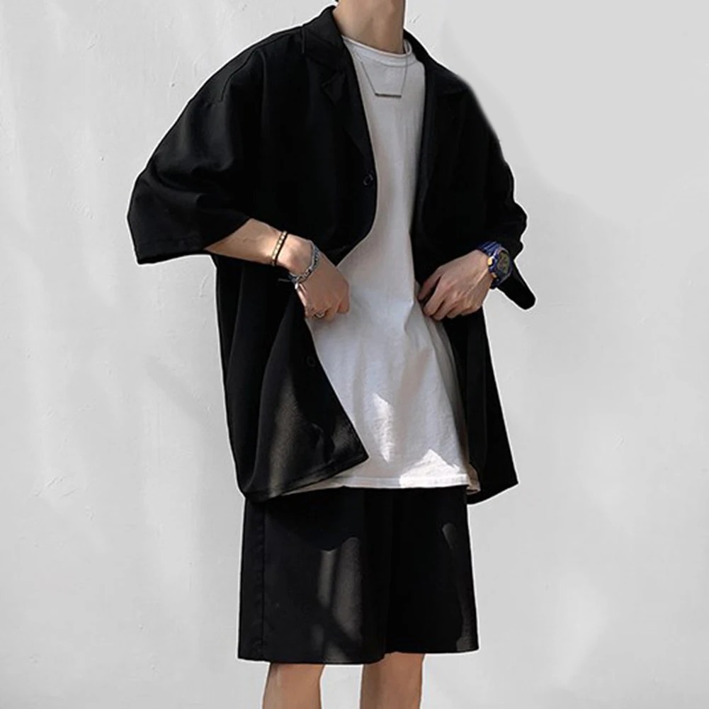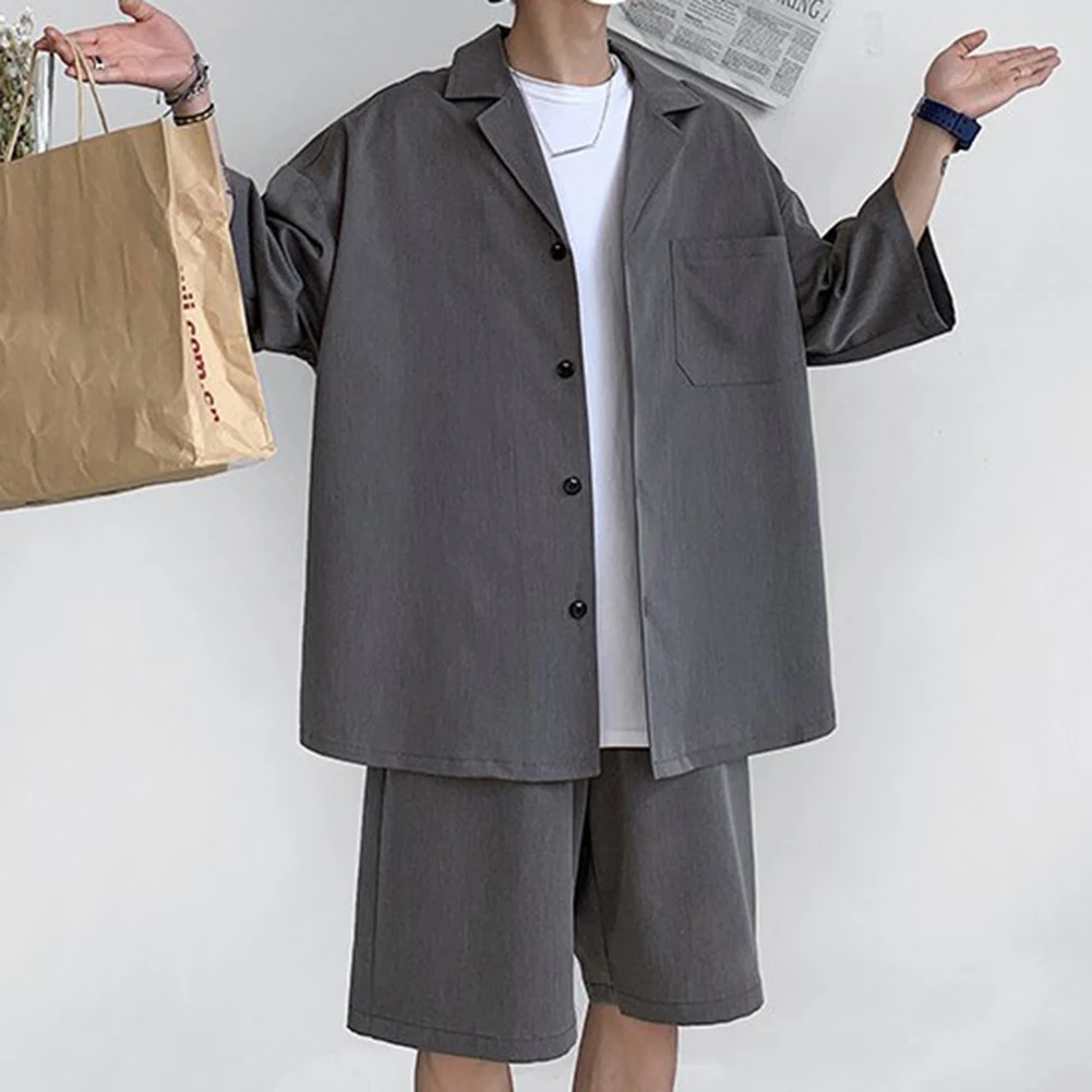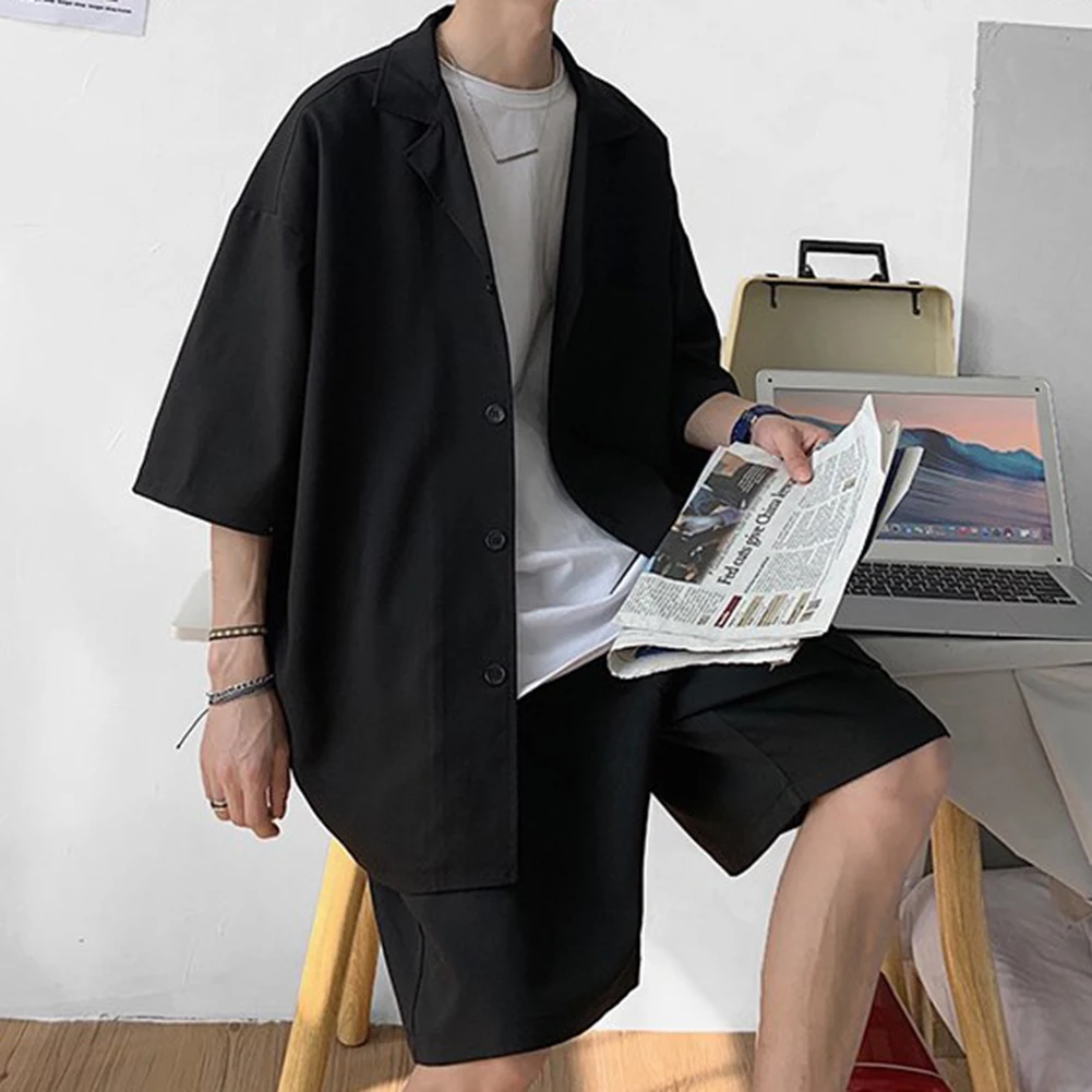 * Item Features:Men,Summer 2 Piece Set,Suit Jacket and Shorts,Korean Style Clean Fit Loose Short Shirt Outfits