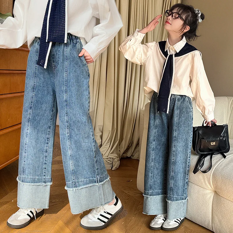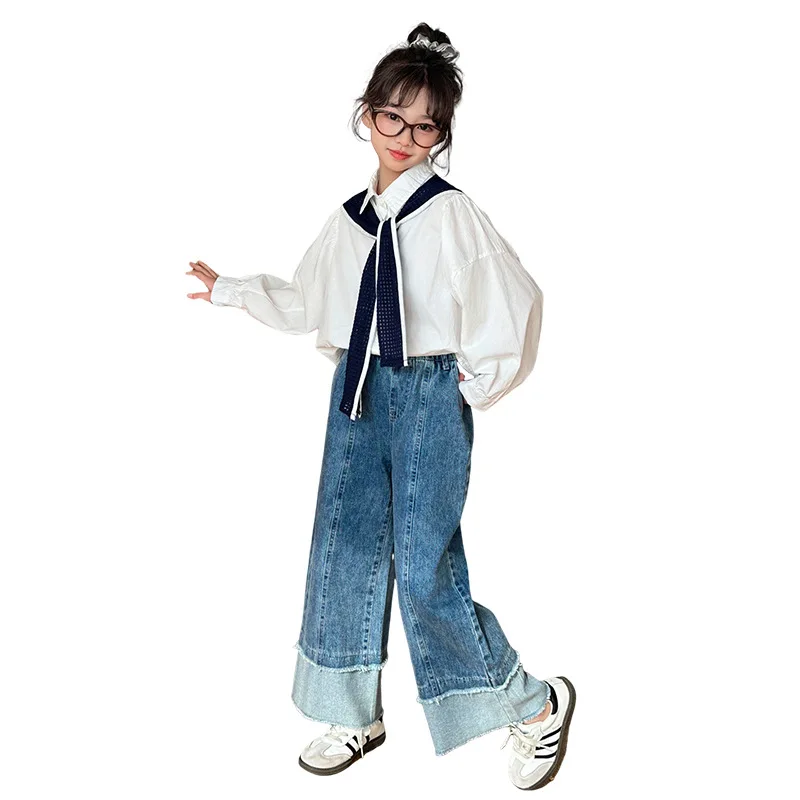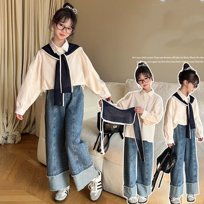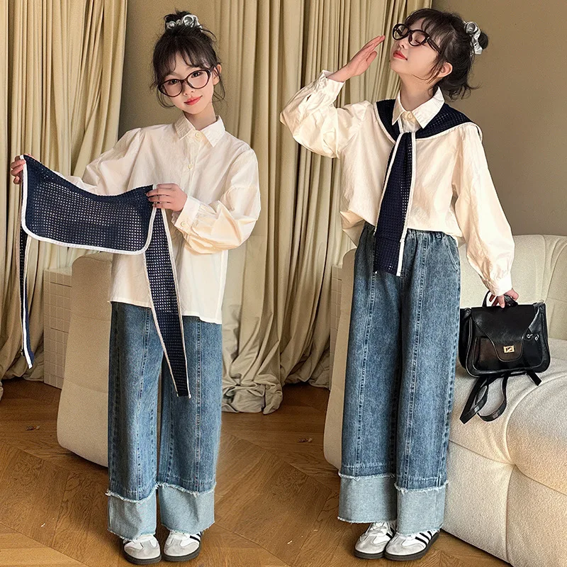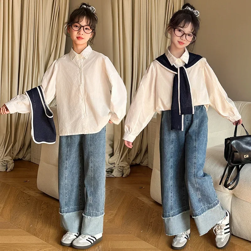 Korean Baby Girls Autumn Sets New Turn Down Collar T-shirt+Contrast Color Shawl+Patchwork Denim Pant Children Girls 3pcs Sets