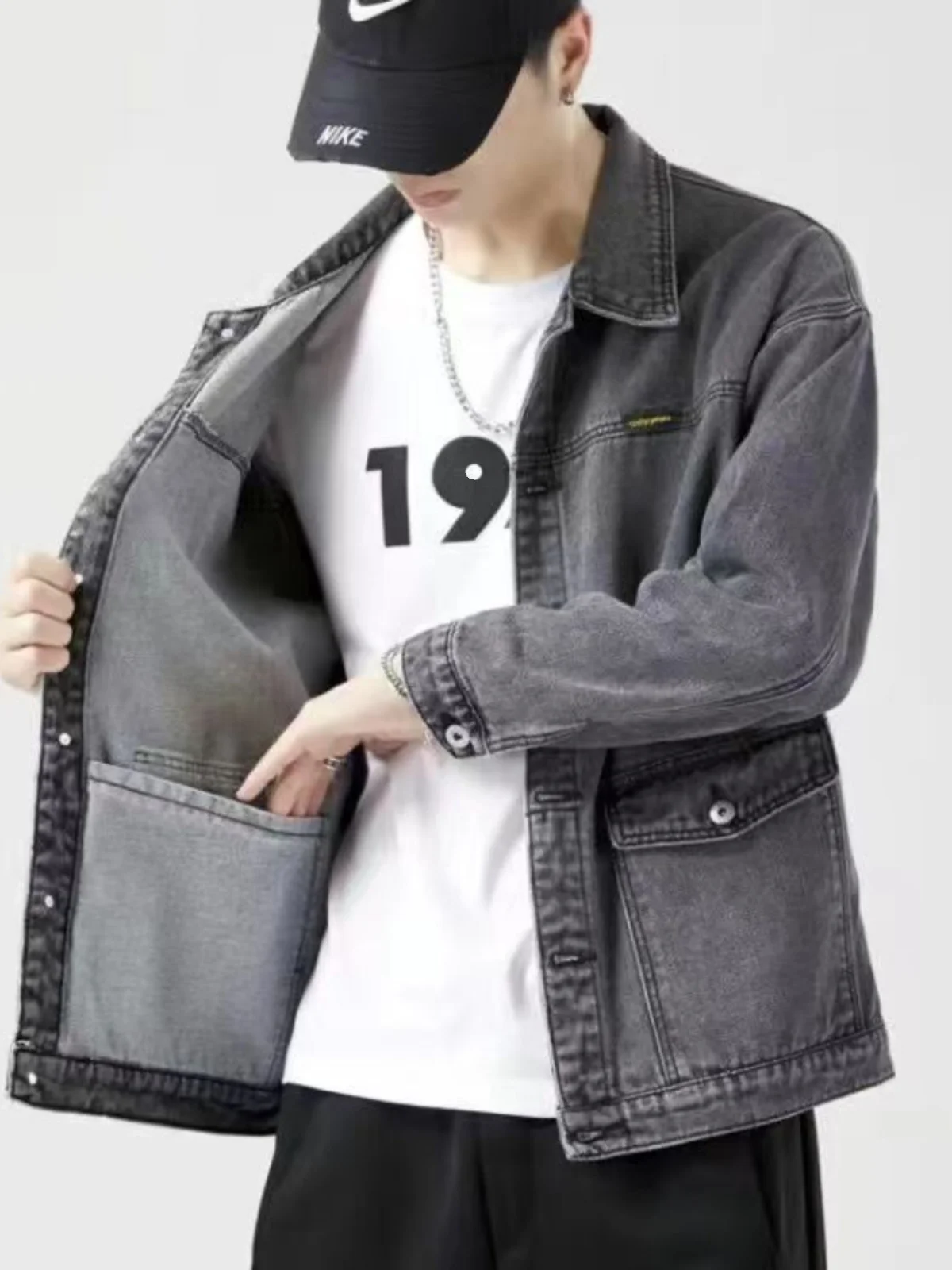 The jacket features a loose fit design, providing comfort and a stylish look for young men.