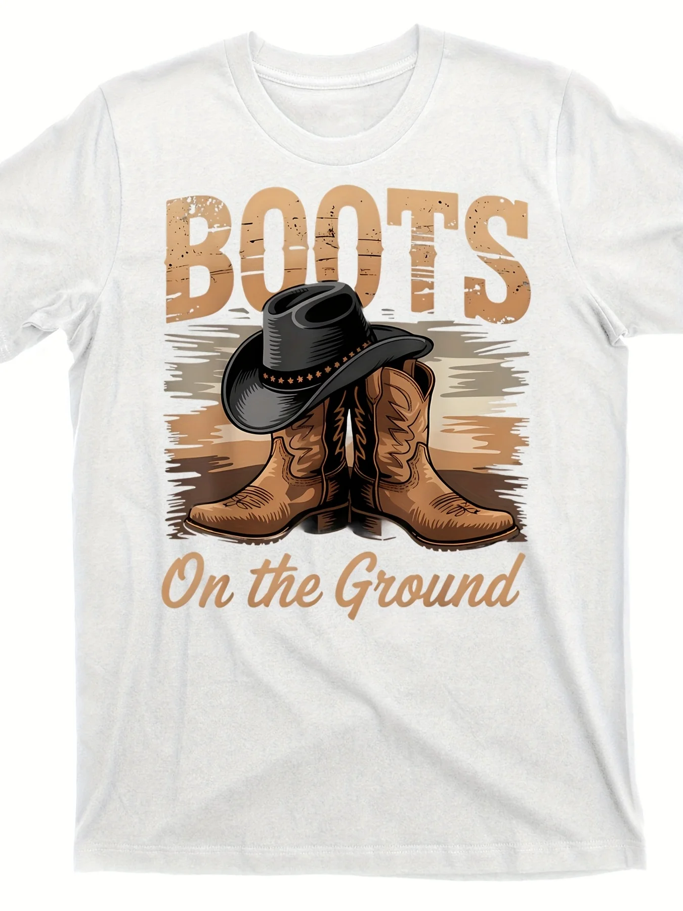 Men’s Vintage Cowboy Boot Graphic T-Shirt, Design Inspired by the Boots Themselves, Comfortable Cotton Crew Neck Short-Sleeve T-Shirt, Casual Wear, Beige Vintage Style Shirt, Everyday Use Casual Clothing, Denim-Themed Apparel