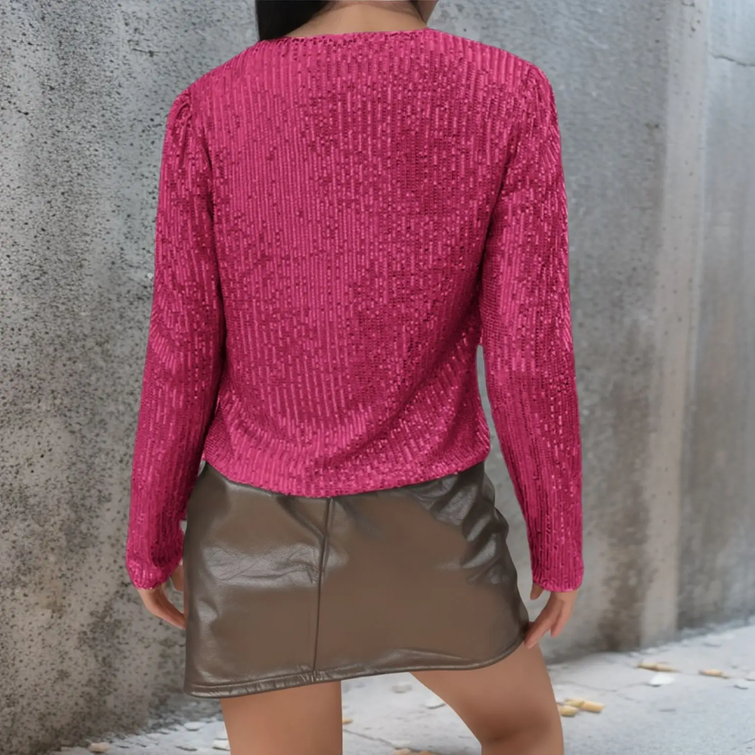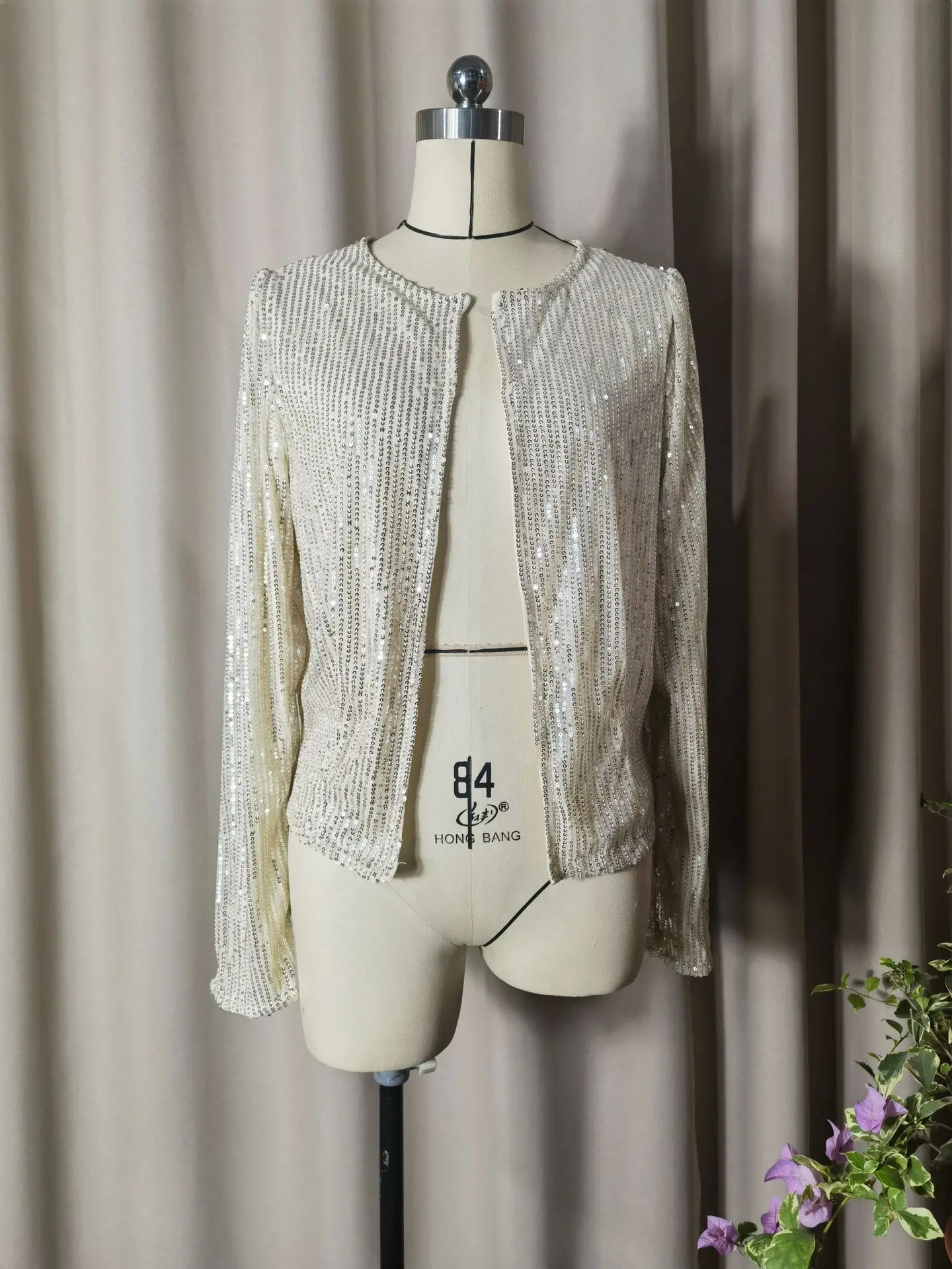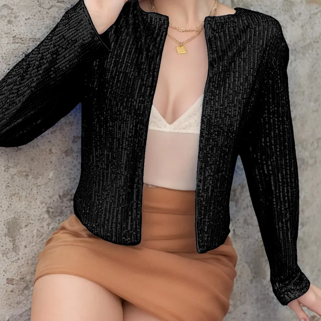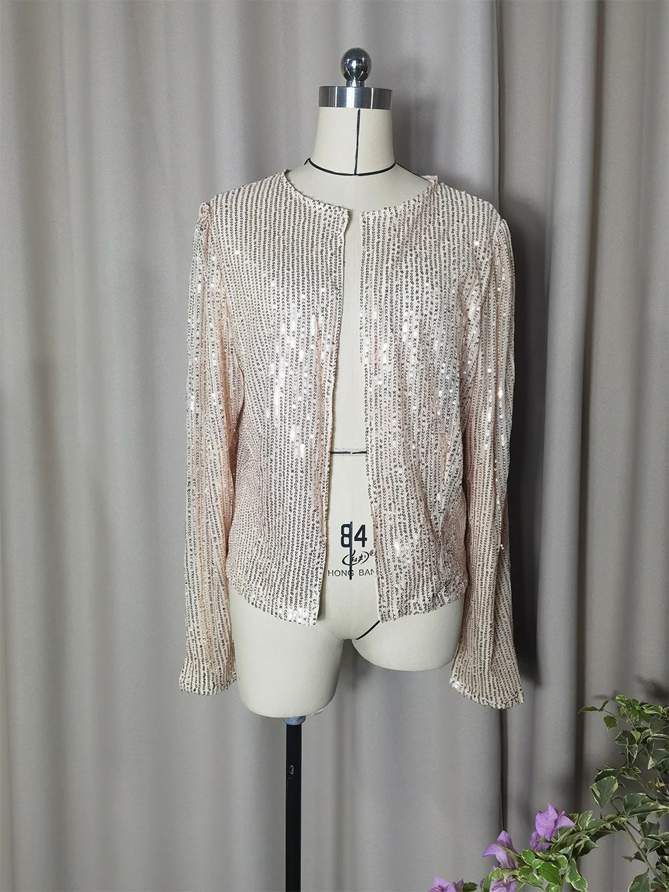 New Winter Clothes Woman Temperament Casual Solid Color Versatile Elegant Slim Coat Long-sleeved Sequined Round Neck Cardigan