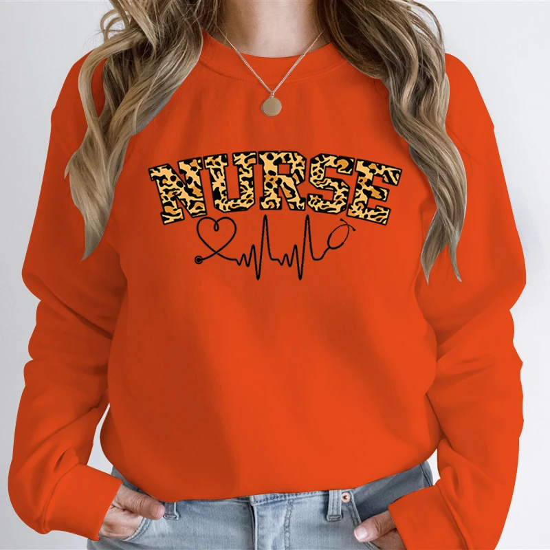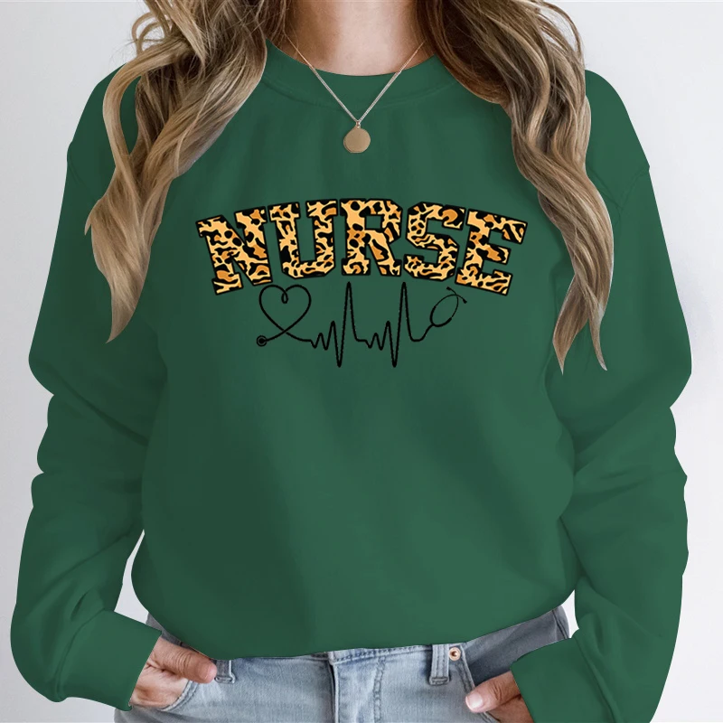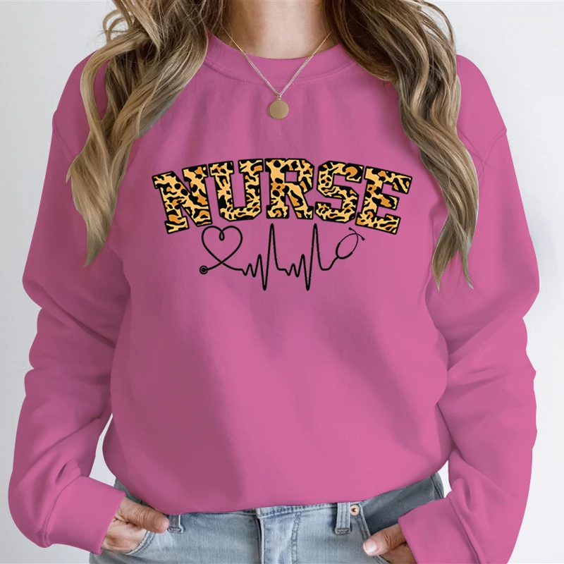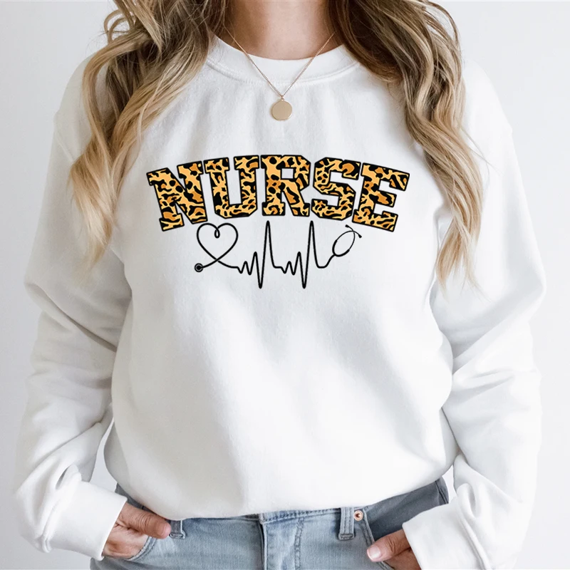 Nurse Leopard Print Women Casual Hoodies Registered Nurse Autumn Sweatshirt Leopard Lover Stethoscope Heart Graphic Sweatshirts