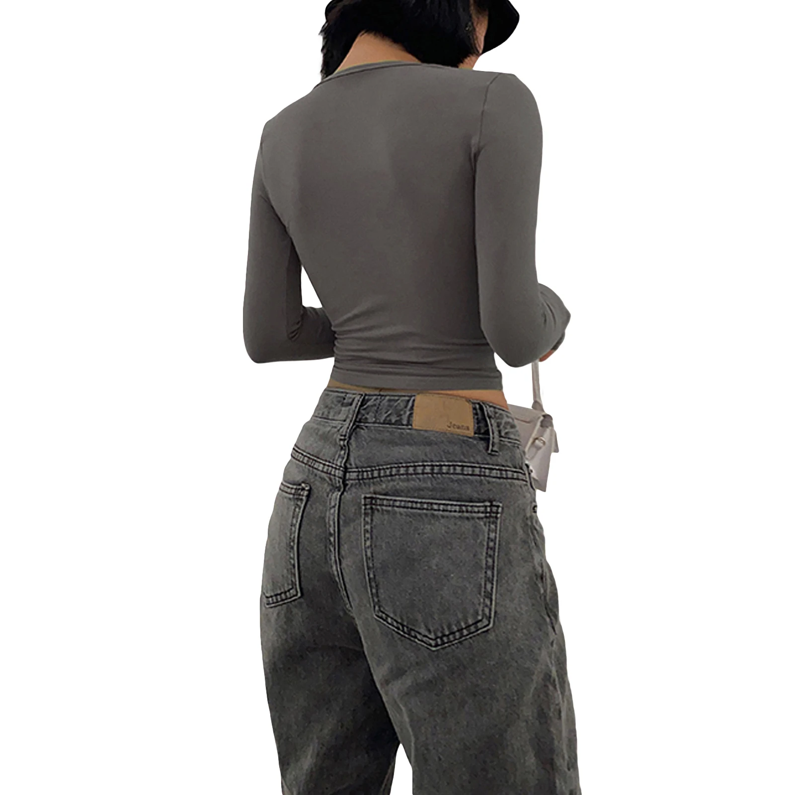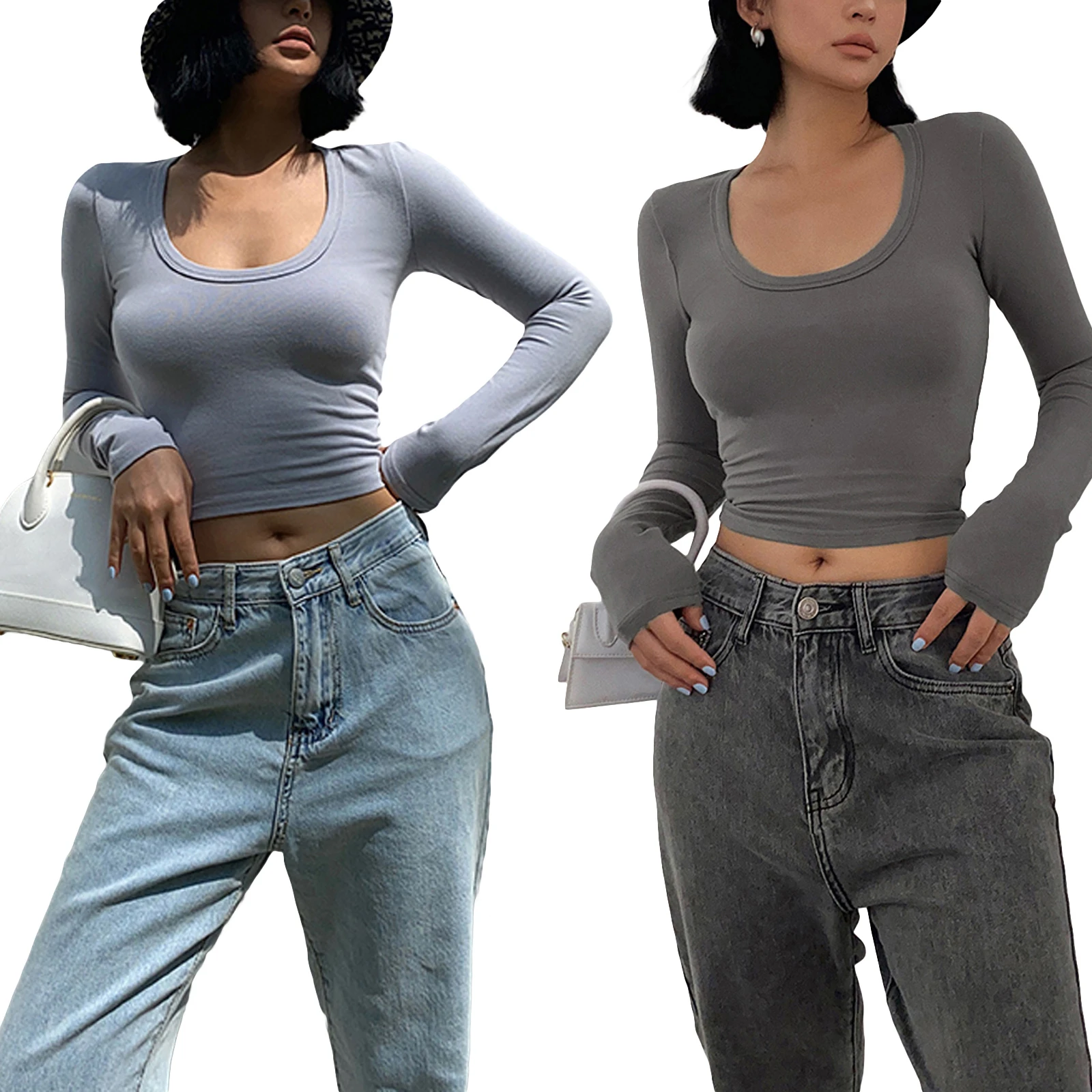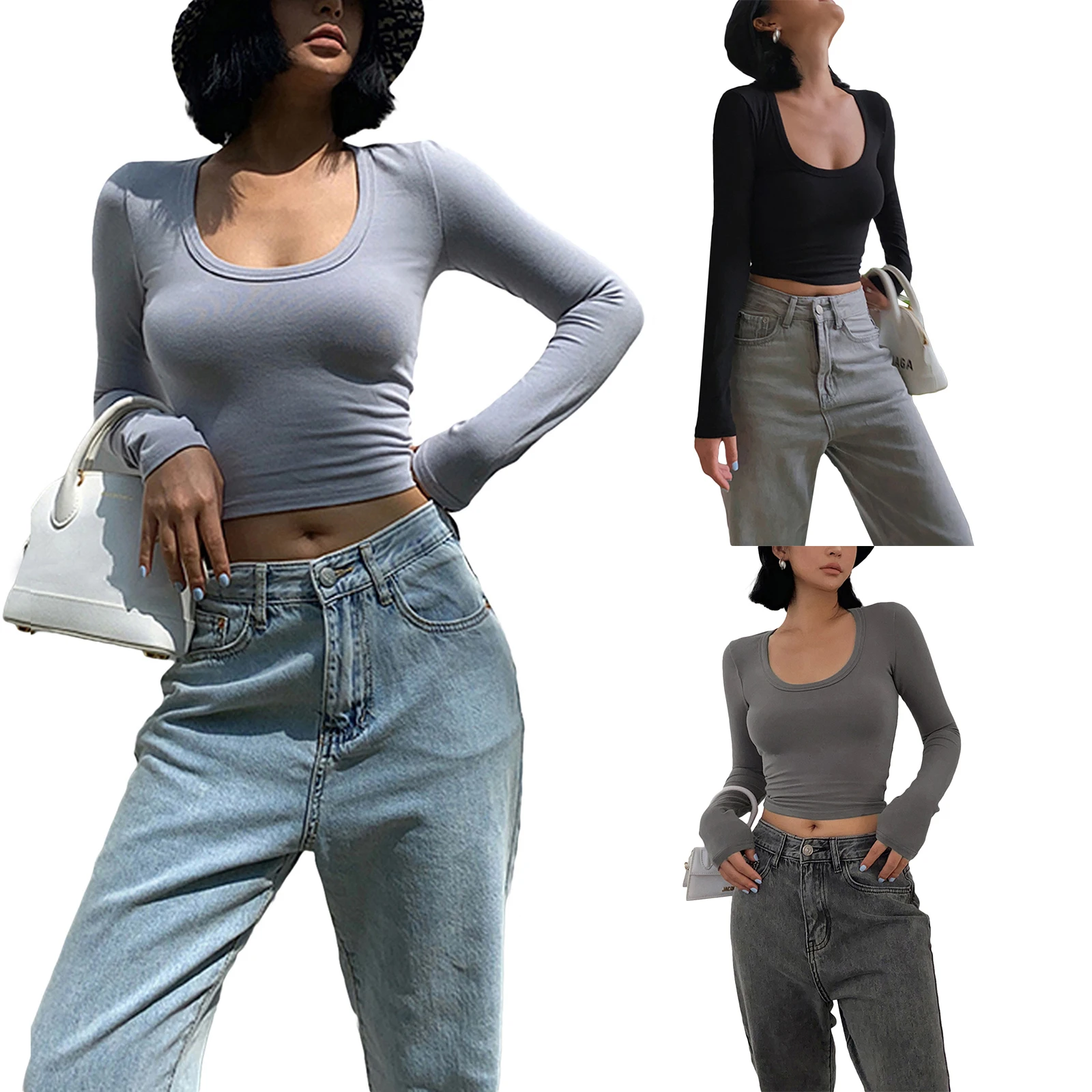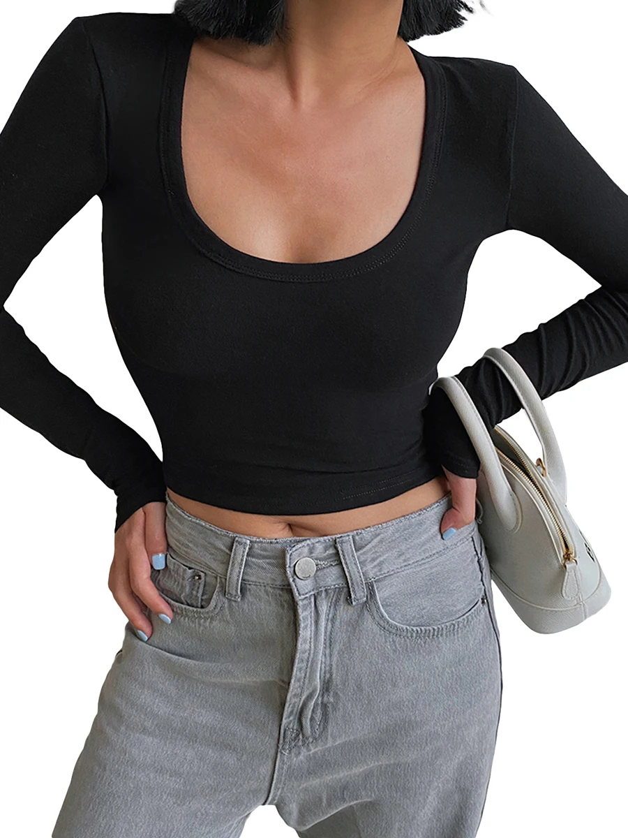 Women’s Spring Autumn Slim Crop Tops Solid Color Long Sleeve Low Cut T-shirt