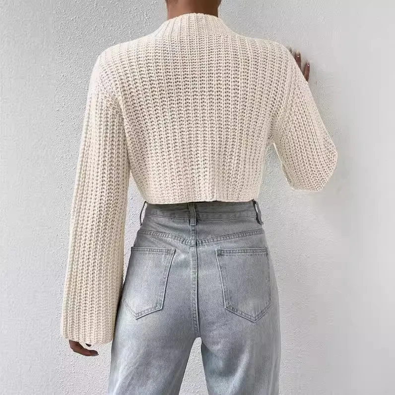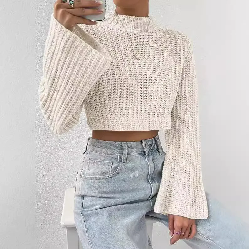 Women’s Sweater 2024 Autumn New Solid Color Versatile Flare Sleeve Half High Collar Long Sleeved Casual Crop Pullover Sweater